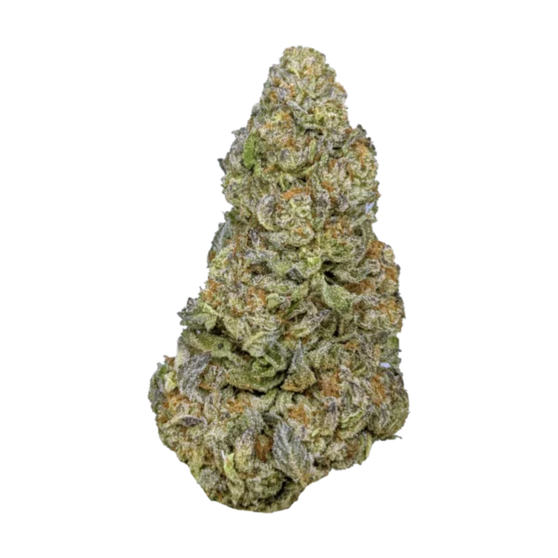 Its dense, frosty buds showcase deep greens and purples with a thick coating of trichomes, reflecting its premium quality and high potency.